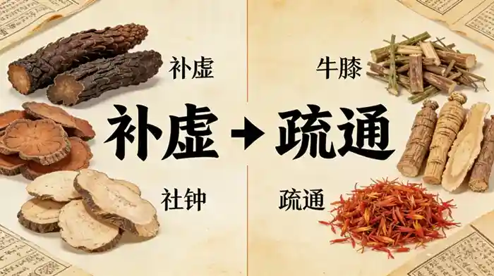 | 牛膝 | 《名医别录》:“疗伤中少气…填骨髓”。活血兼补。 | 选用川牛膝,活血通经力更强。30克保证“引药下行”效果到位。 |