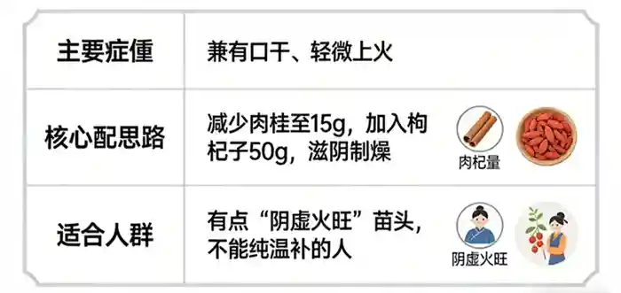 | 兼有口干、轻微上火 | 减少肉桂至15g,加入枸杞子50g,滋阴制燥 | 有点“阴虚火旺”苗头,不能纯温补的人 |