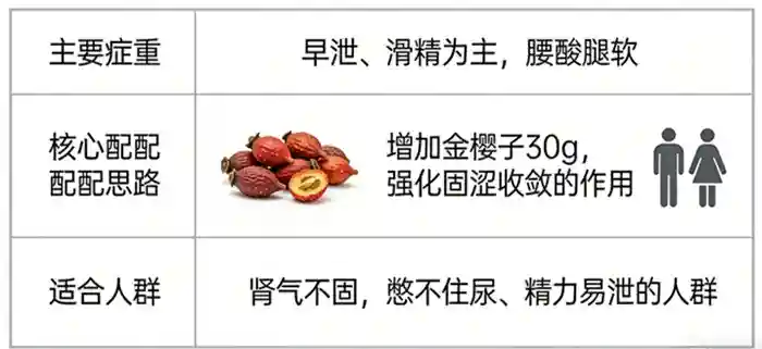“早泄、滑精为主,腰酸腿软” 对应 “增加金樱子 30g,强化固涩收敛的作用” 及 “肾气不固,憋不住尿、精力易泄的人群”