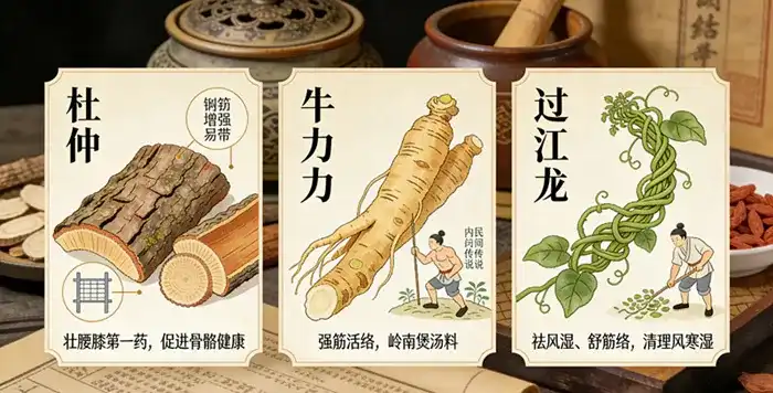 除了上面提到的杜仲、牛大力,古籍里记载的还有续断、骨碎补、狗脊、桑寄生等。但中药讲究配伍,单用一味效果有限,必须根据体质(是偏寒还是偏湿,是虚还是瘀)来组合,这也是我们这个18味配方复杂的原因——它考虑得更全面。